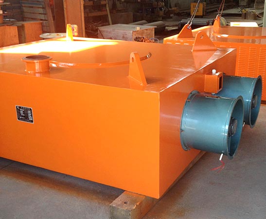 風(fēng)冷電磁除鐵器,采用空調(diào)或軸流風(fēng)機強迫風(fēng)冷,增加風(fēng)道,增大線路與空氣的接觸面積,改善風(fēng)冷效果。大型除鐵器采用軸流風(fēng)機,風(fēng)壓高,風(fēng)量大,風(fēng)冷效果強。控制柜采用聯(lián)鎖機構(gòu),即風(fēng)機一停,除鐵器勵磁立即停電報警。